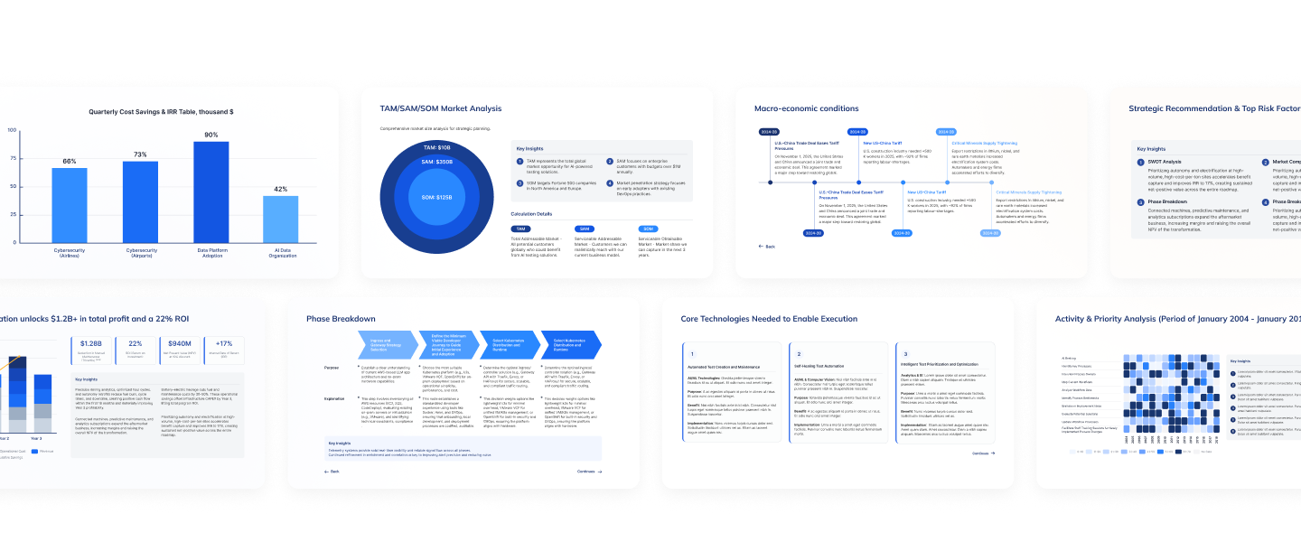 Validate opportunities faster with structured market intelligence and decision frameworks built for your specific context, not generic templates.