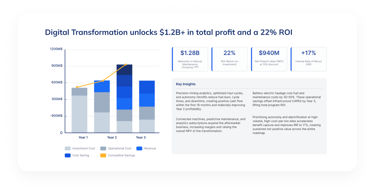 Design and execute transformation programs with proven frameworks and real-time intelligence. Keep all stakeholders aligned from kickoff through delivery.
