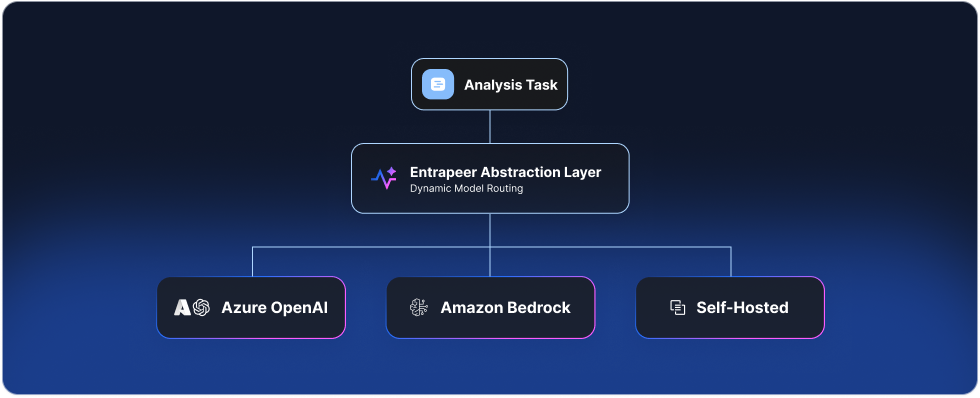 Entrapeer's architecture does not hard-code a single AI model or provider. We use an abstraction layer that routes each analysis task to the most appropriate model based on reasoning requirements, output type, and your organization's compliance needs. For VPC deployments, clients can plug in their preferred AI providers, including Azure OpenAI, Amazon Bedrock, or self-hosted models. Your organization's AI governance policies, model preferences, and data residency requirements are respected at the infrastructure level.